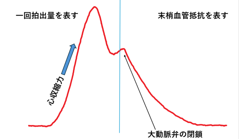 波形の立ち上がりは心収縮を表し、大動脈弁が閉じる(ディクロティックノッチ)ところで凹みとして圧の変化が表示されます。大動脈弁閉鎖を起点に左側は一回拍出量を示し、右側は末梢血管抵抗を表します。