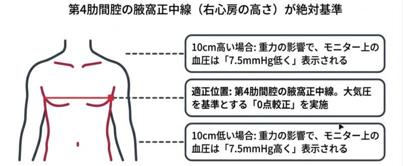 体位変換やリハビリなどで患者さんが動いた後は、必ず位置を確認し、必要に応じて0点校正(大気圧を教える作業)を行いましょう 。