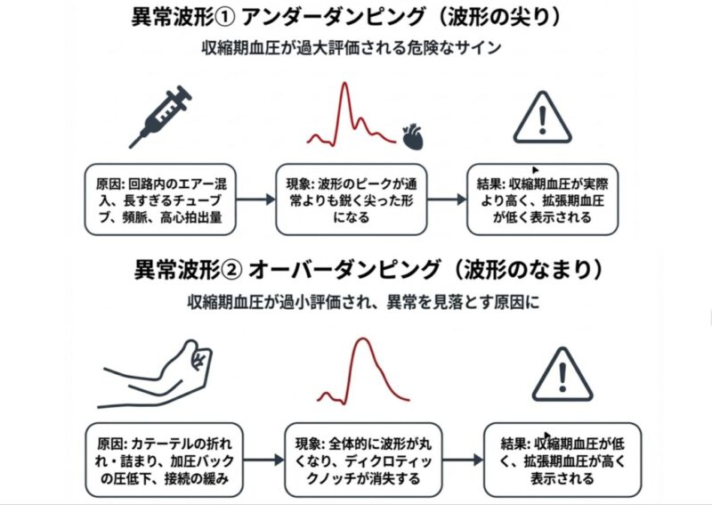 • アンダーダンピング(オーバーシュート): 波形の先が尖り、収縮期血圧が過大評価されます 。原因はエアーの混入、チューブが長すぎること、頻脈、動脈硬化などです 。