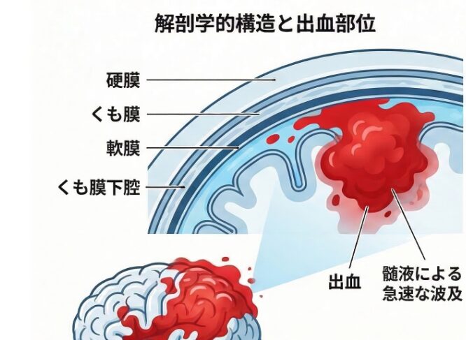 脳は外側から硬膜・くも膜・軟膜の3層に包まれています。SAHは、くも膜と軟膜の間にある「くも膜下腔」に出血が起こる病態です。この空間には脳脊髄液(髄液)が循環しており、出血が起こると血液は髄液に乗って急速に脳全体へと波及します。脳実質には痛覚はありませんが、血管、髄膜を中心に痛覚があり、SAHが起こると激しい痛みと痛みの発生したタイミングを鮮明に覚えていることが特徴です。
