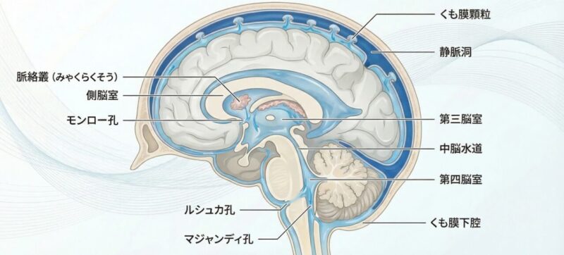 - 側脳室 → モンロー孔 → 第3脳室 → 第4脳室